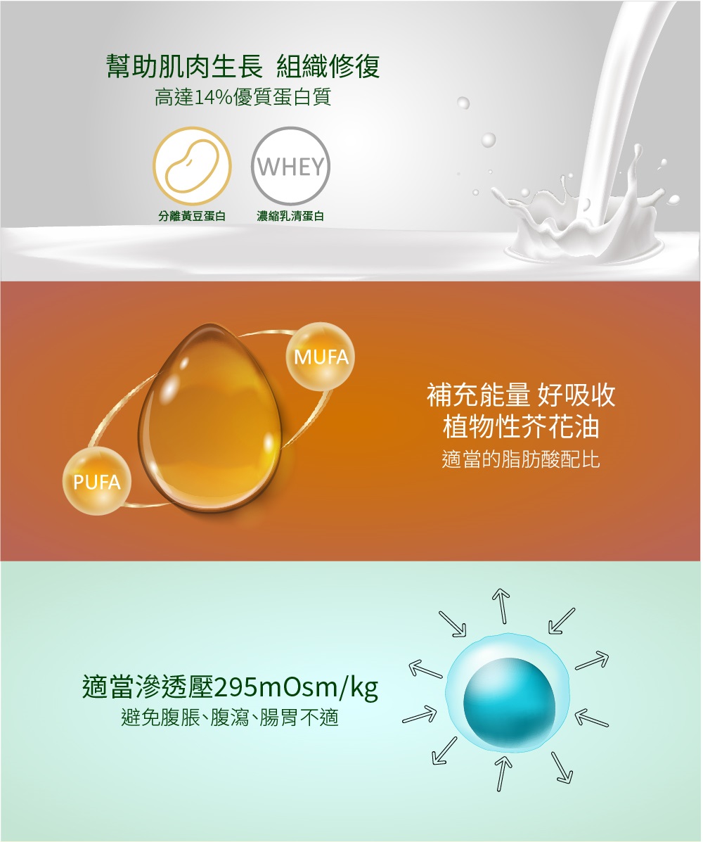 .成分:芥花油粉〔葡萄糖漿、芥花油、 乾酪素鈉、脂肪酸甘油酯、消泡 劑(氫化棕櫚油、脂肪酸山梨醇酐 酯、卵磷脂、二氧化矽)、乳酸硬 脂酸鈉、磷酸氫二鉀、二氧化 矽、香料、β-胡蘿蔔素、單及雙 脂肪酸甘油?二乙醯酒石酸酯〕、 麥芽糊精、乳清蛋白、黃豆蛋白、 多種礦物質(麥芽糊精、氯化 鈉、碳酸鈣、碳酸鎂、氯化鉀、 碳酸氫鈉、二氧化矽、磷酸鐵、 硫酸鋅、硫酸錳、亞硒酸鈉、硫 酸銅、三氯化鉻、碘化鉀、鉬酸 鈉)、黃豆纖維(基因改造)、無 水磷酸氫鈣、氯化鉀、重酒石酸 膽鹼、多種維生素【麥芽糊精、 維生素C、維生素E(維生素E、 麥芽糊精、辛烯基丁二酸鈉澱 粉、二氧化矽)、菸鹼醯胺、維生 素A〔麥芽糊精、阿拉伯膠、維 生素A、維生素E(抗氧化劑)〕、 本多酸鈣、維生素D3〔辛烯基丁 二酸鈉澱粉、蔗糖、中鏈三酸甘 油酯、維生素D3、維生素E(抗氧 化劑)、維生素C(抗氧化劑)、 二氧化矽〕、生物素(麥芽糊精、 生物素)、維生素K1(阿拉伯膠、 維生素K1、蔗糖)、維生素B6、 維生素B1、維生素B2、葉酸、維 生素B12(麥芽糊精、檸檬酸鈉、 檸檬酸、維生素B12)】、玉米糖 膠、香草香料、氧化鎂、鋅酵母。